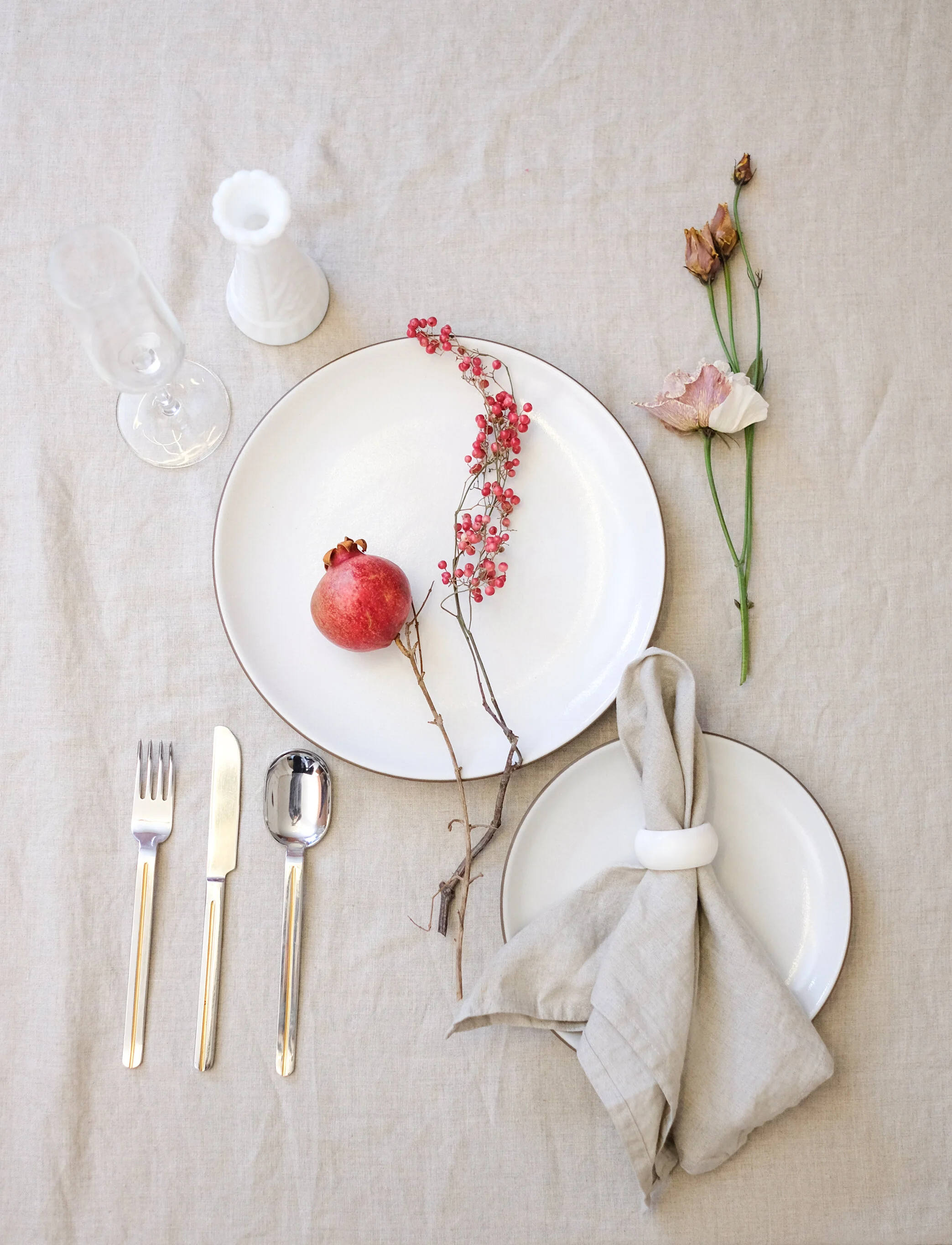 The greenery - we set both tables with whatever greenery was in season, using them to anchor the fall and winter feelings without getting too kitschy with themed things. It feels fresh and elegant, but not too rustic when contrasted with the clean lines of the plates and flatware.