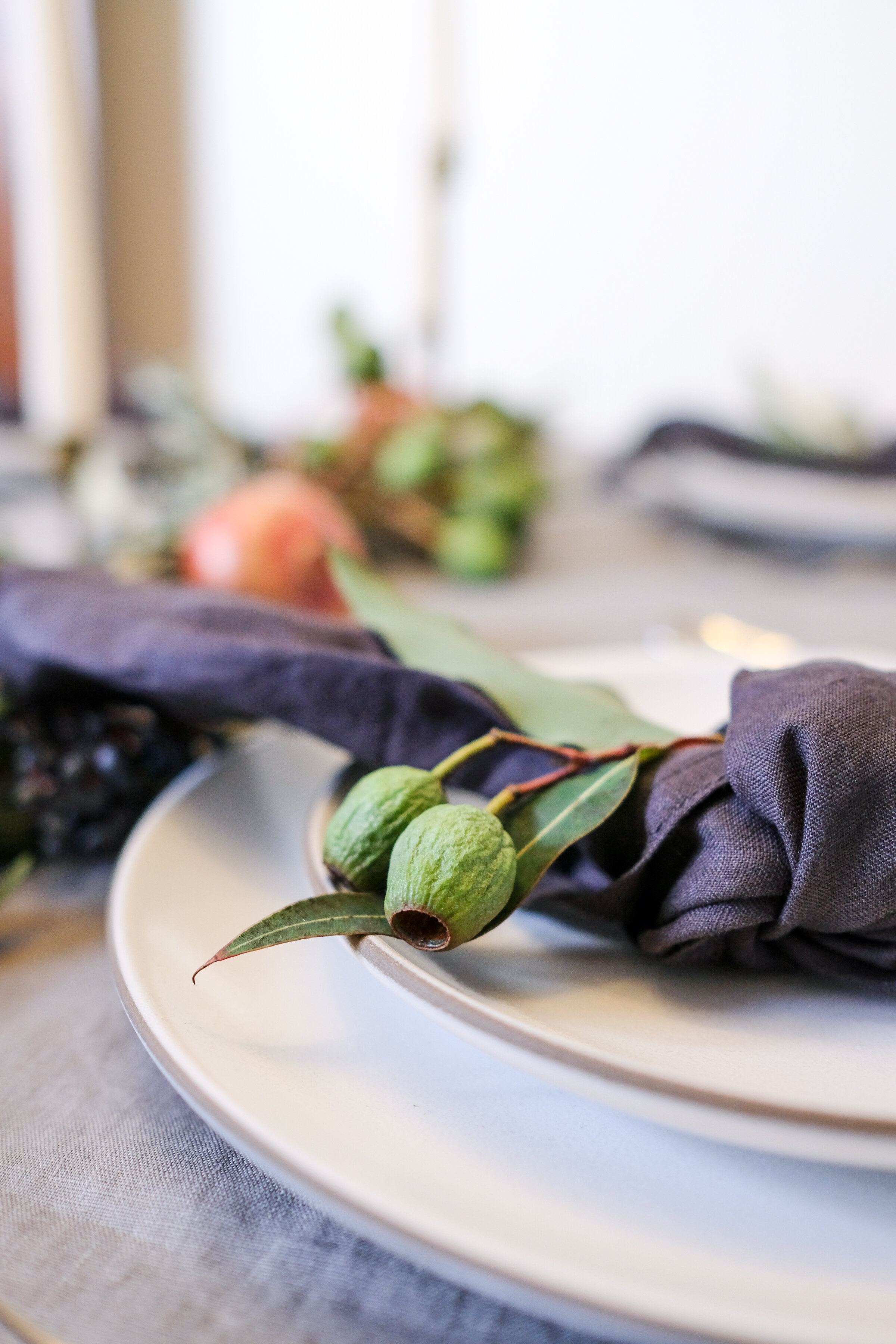 To decorate, we opted for a dark grey linen table cloth and charcoal linen napkins. Then we mixed up our foliage, choosing heavier pieces (but still keeping the adorable pomegrantes) like olive branches (with real live olives attached!), bell-like greens, and dark berries.